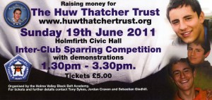 Jordan Craven is a good friend of Huw’s who takes part in the Holme Valley Black Belt Academy. ‘Crov’ as he is known, came up with the idea of an event run with his club to raise funds for Huw’s trust – and to remember Huw. Over the last month or so Crov has set up the event, arranged printing for the tickets, promoted the event and then took part in it himself. The end result – an entertaining event, promotion of the sport, getting a load of good people together, a sense of achievement for all the participants and most of all remembering Huw and raising £500 for Huw’s trust. Well done Crov and here is a bit more about the event.