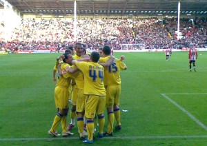 Saturday 1st September also saw Cardiff’s Peter Whittingham score a hat trick – the last time a Cardiff City player scored a hat trick was again Peter Whittingham – it was an away match at Sheffield on 24th October 2010 – and Huw, Carys and I were there. Here is a picture of the players celebrating Whitts’ 3rd goal right in front of us 3 nearly 2 years ago. Whitts was one of Huw’s favourite players and one of the few of his favourites still at the club. I am so pleased this player is still at Cardiff and I treasure the framed Cardiff City shirt I have signed by Whitts which is hanging up in my living room with ‘Thatch’ and ‘2’ on the back ♥♥♥