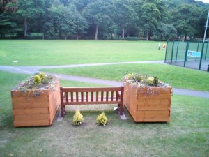 Sands has always been a special place for Huw – like it has for many people who spend their childhood and teenage years in Holmfirth. Huw first visited Sands in his pushchair and started playing their as soon as he could walk – using the play area over the bridge as a toddler and later with Carys joining him. An early friend he played with as a toddler at Sands was Matthew Woolhouse. Sands is a very special place and a beautiful bench engraved as shown in the pictures, and plant tubs now sit proud on a slightly raised area overlooking the park.